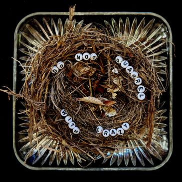 Life Is Served is a series of assemblages created from bird’s nests, lettered beads, and antique glass serving ware. The collective meaning of the works points to the nature of home, comfort, ancestorial wisdom, transitions from childhood to adulthood, and life challenges. With an air of Southern Gothic sensibilities coupled with Black Irish styled humor, the works signify romanticism, nostalgia, longing, belonging, sarcasm, irony, and anger. The text sewn into the nests focuses on words of wisdom, often heard phrases of advice or warning, and/or responses to situations which may or not be helpful