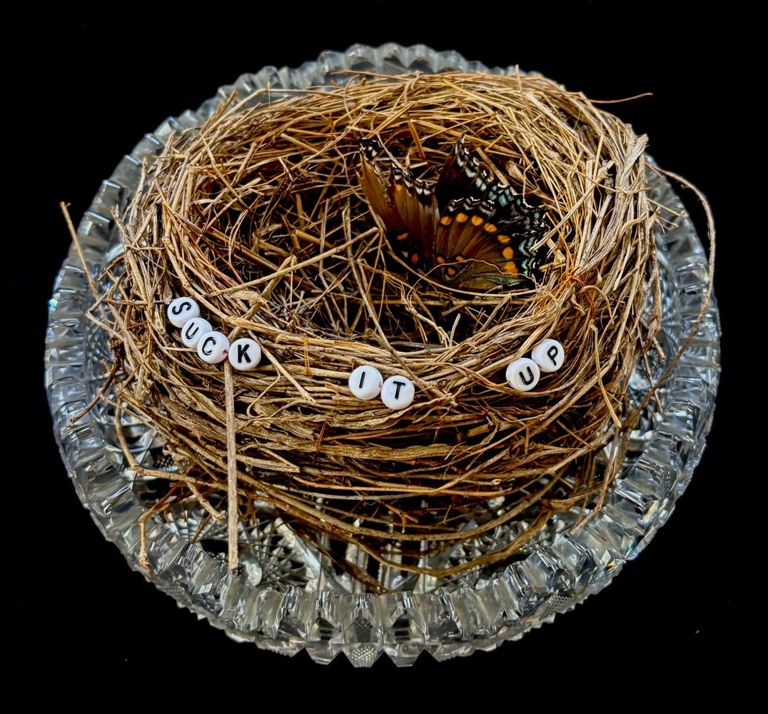 Life Is Served is a series of assemblages created from bird’s nests, lettered beads, and antique glass serving ware. The collective meaning of the works points to the nature of home, comfort, ancestorial wisdom, transitions from childhood to adulthood, and life challenges. With an air of Southern Gothic sensibilities coupled with Black Irish styled humor, the works signify romanticism, nostalgia, longing, belonging, sarcasm, irony, and anger. The text sewn into the nests focuses on words of wisdom, often heard phrases of advice or warning, and/or responses to situations which may or not be helpful